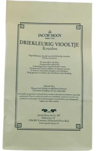Jacob Hooy Driekleurig Viooltje Gesneden (80 gram) is een natuurlijk kruidenproduct dat al eeuwenlang gebruikt wordt. Jacob Hooy Driekleurig Viooltje kan zowel warm als koud gedronken worden en mag gezoet worden. Het driekleurig viooltje, ook wel bekend als het driekleurig